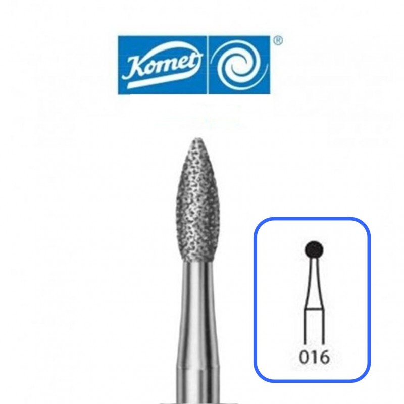 ( 368314016 ) Fresas 368 Komet - Diamante - Tamaño 016 - Para Turbina (314) - Grano Medio - Forma Llama - Indicada para Preparación de Coronas - Obturaciones - Tallado Oclusal/Lingual - Blister 5 unidades