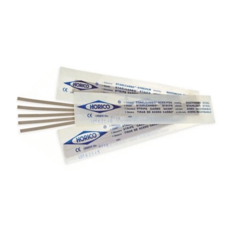 Tiras Acero Horico - Tiras de separar - Fabricadas en acero inoxidable - Anchura: 6 mm (consultar disponibilidad y precio para ancho 4 mm) - Abrasivo en 1 cara (consultar disponibilidad y precio de 2 caras activas) - Antes de usar cortar el largo deseado - Presentado en envase de 12 unidades