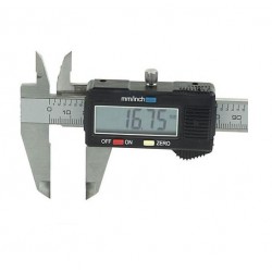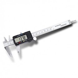 Calibre Digital Pie de Rey - Con pantalla digital que facilita la lectura de las medidas - Precisión de 1 centésima de mm - Botón automático de puesta a cero - Botón selector de mediciones en milímetros o pulgadas - Rango de medida (mm): de 0 a 150 - Longitud calibrador (mm): 235 - Estuche - Batería SR44
