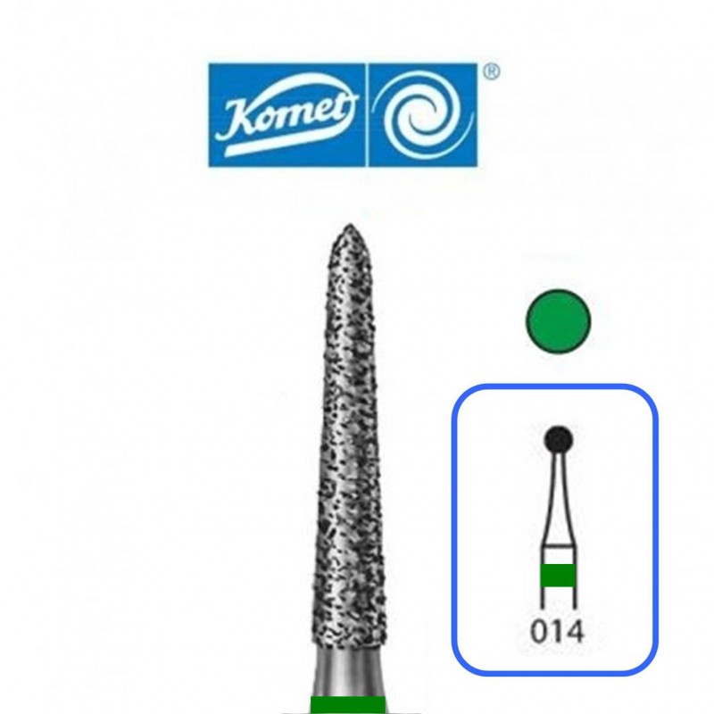 ( 6878K314014 ) Fresas 878K Komet - Diamante - Tamaño 014 - Para Turbina (314) - Grano G-Grueso (Aro Verde) - Forma Cónico con Bisel - Chamfer - Indicada para Coronas - Ángulo - Blister 5 unidades