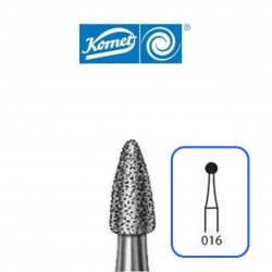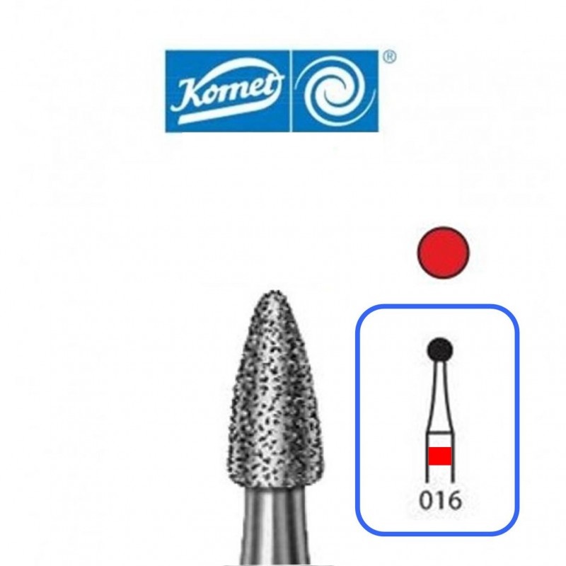 ( 8390314016 ) Fresas 8390 Komet - Diamante - Tamaño 016 - Para Turbina (314) - Grano F-Fino (Aro Rojo) - Forma Bala - Granada - Indicada para Obturaciones - Blister 5 unidades