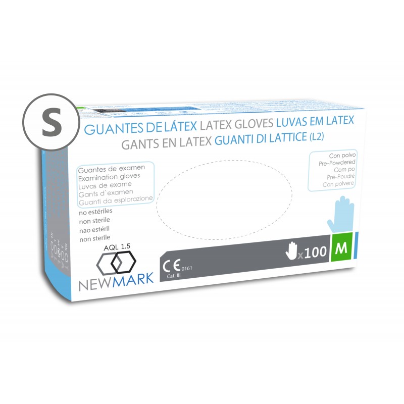 ( 17911 M ) Guantes Latex empolvados NewMark Sanicen - Talla S (Pequeña) - Guantes 100% Latex natural - Con Polvo - AQL 1'5 - No Estériles - Higiénicos - Ambidiestro - Un sólo uso - Adaptabilidad anatómica - Presentación en cajas dispensadora de 100 unidades - Cat. III Equipo de Protección Individual - EN 420:2003+A1:2009 (requisitos generales para los guantes) - EN ISO 374-1:2016 / A1:2018 (Protección contra productos Químicos) - EN ISO 374-5:2016 (Protección contra Microorganismos)