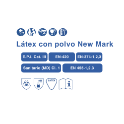 ( 17611M ) Guantes Latex empolvados NewMark Sanicen - Talla L (Grande) - Guantes 100% Latex natural - Con Polvo - AQL 1'5 - No Estériles - Higiénicos - Ambidiestro - Un sólo uso - Adaptabilidad anatómica - Presentación en cajas dispensadora de 100 unidades - Cat. III Equipo de Protección Individual - EN 420:2003+A1:2009 (requisitos generales para los guantes) - EN ISO 374-1:2016 / A1:2018 (Protección contra productos Químicos) - EN ISO 374-5:2016 (Protección contra Microorganismos)