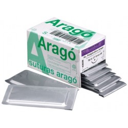 ( 43023 ) P. G. A. 4/0 Suturas Aragó - Sutura sintética trenzada absorbible de Ácido Poliglicólico - Absorción media 60-90 días – Incoloro - Aguja triangular de 3/8 (TB15) - Caja con 12 unidades - Disponibilidad según fabricante en: 3/0, 4/0, 5/0, 6/0
