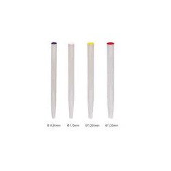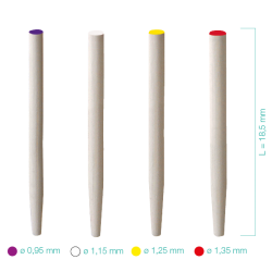 Postes Fibra de Vidrio Dentoclic Itena – Diámetro: Ø 0,95mm (Color Violeta) - Reposición / recarga de Postes - Translúcido - Indicado para la reconstrucción de muñones con composite sobre dientes anteriores o posteriores - Módulo de elasticidad muy similar al de la dentina - Reparto homogéneo de las tensiones mecánicas – Radiopacidad - Compuestos por un 80% de fibra de vidrio y un 20% de resina - Asimilación de la deformación favorable para el diente - Permite realizar reconstrucciones protésicas totalmente cerámicas mejorando así el aspecto estético - Integración en las reconstituciones en cerámica realizadas en laboratorio - Técnica directa: posibilidad de realizar la reconstrucción en una sola sesión - Alta adhesión del material de reconstrucción al poste radicular - Bio compatibilidad y ausencia de toxicidad - Sin riesgo de corrosión ni de pigmentación del tejido - Idéntica forma a la gama cilindro/cónica metálica, y calcinable de Dentoclic - Taladros y accesorios idénticos a los de la gama Dentoclic - Fácil tratamiento en caso de necesitar reendodoncia. - Longitud de los muñones: 18,5 mm